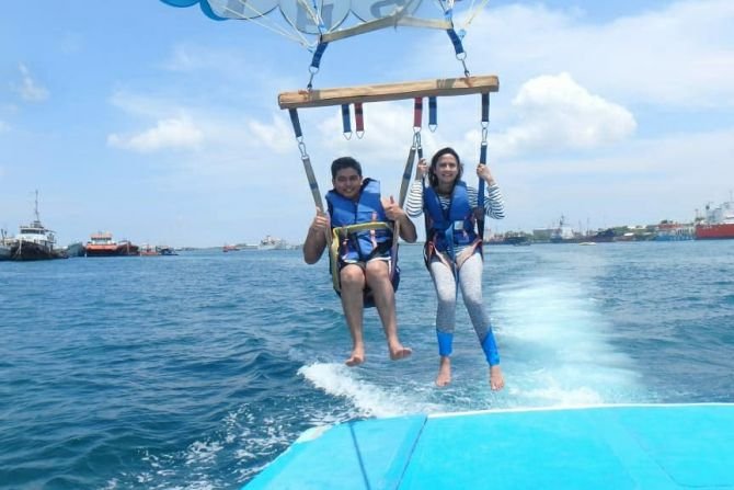 Terbang menggunakan parasut di atas laut Nusadua.Cocok direkandenganGopro, unt uk trip pasangan ataupun keluarga.